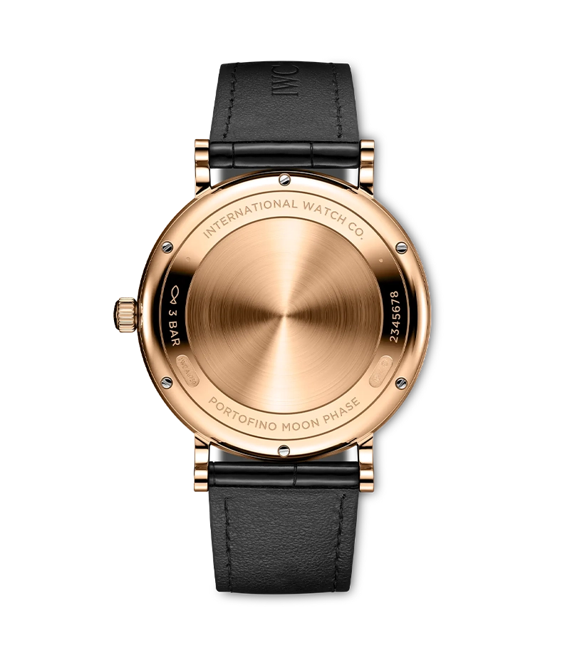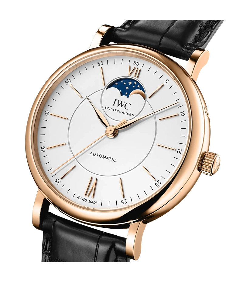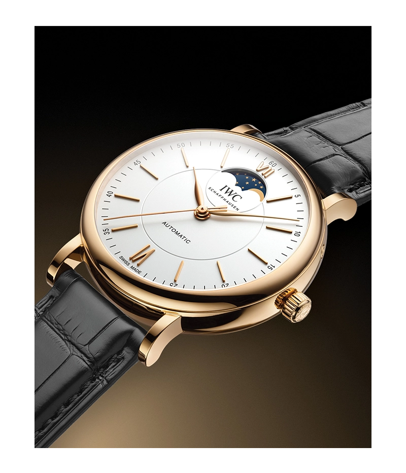 この「ポートフィノ・オートマティック・ムーンフェイズ」は、18Kレッドゴールド製ケースに、シルバーコーティング仕上げの文字盤とゴールドコーティングの針を備え、ブラックのアリゲーター・レザーストラップを組み合わせています。