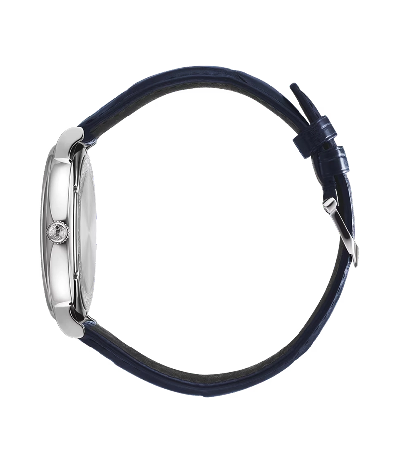 40mmのステンレススチール製ケースを採用したこのモデルは、シルバーコーティングの文字盤、ブルーの針とアップライト・インデックス、上質なアリゲーター・レザーのブルーのストラップが完璧に調和しています。