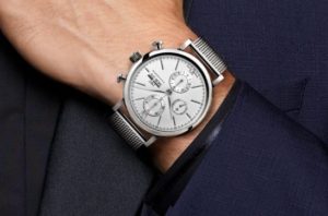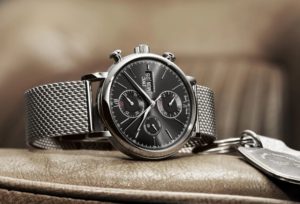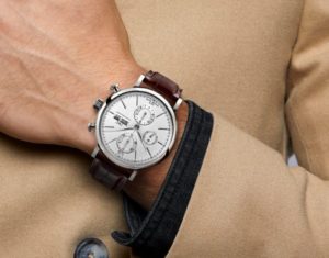 ステンレススチール製ケースに収められたクロノグラフにはドーム型サファイアガラスを採用しており、シルバーコーティングの文字盤にはロジウムコーティングのアップライト・インデックスを組み合わせています。ダークブラウンのアリゲーター・ストラップが取り付けられます。