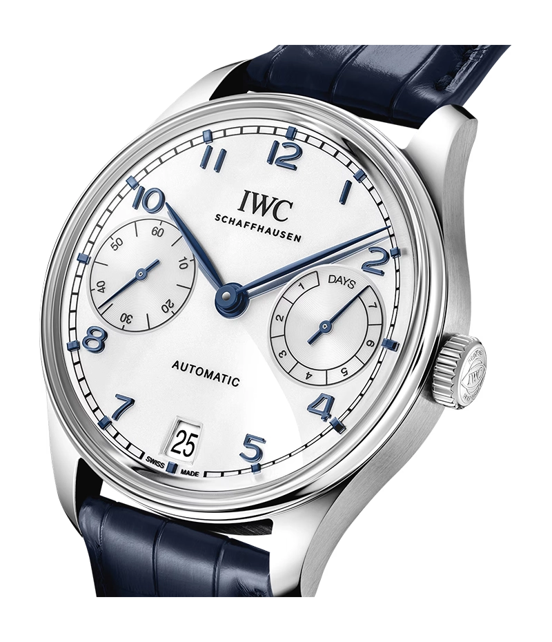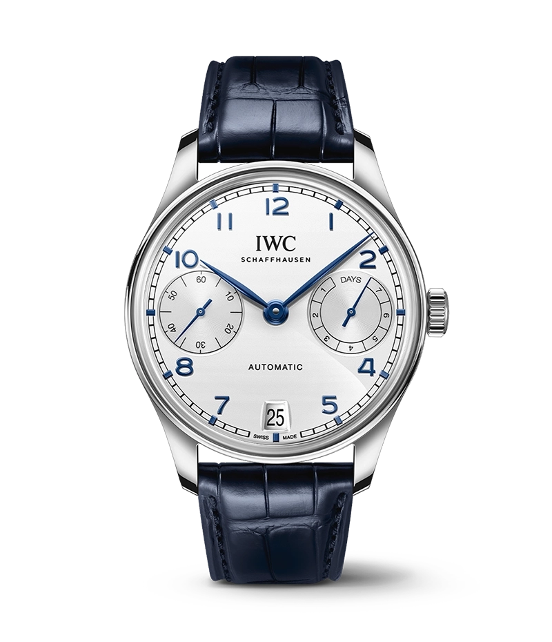 「ポルトギーゼ」の起源は1930年代末にまで遡ります。クロノメーターに匹敵する精度を持つ極めて大型の腕時計を制作するために、IWCシャフハウゼンの高精度ポケットウォッチ・ムーブメントが使われたのです。2000年に初めて登場した「ポルトギーゼ・オートマティック 42」は、すっきりとしたバランスの良い文字盤を持ち、3時位置にパワーリザーブ表示、反対側の9時位置にスモールセコンドを備えています。