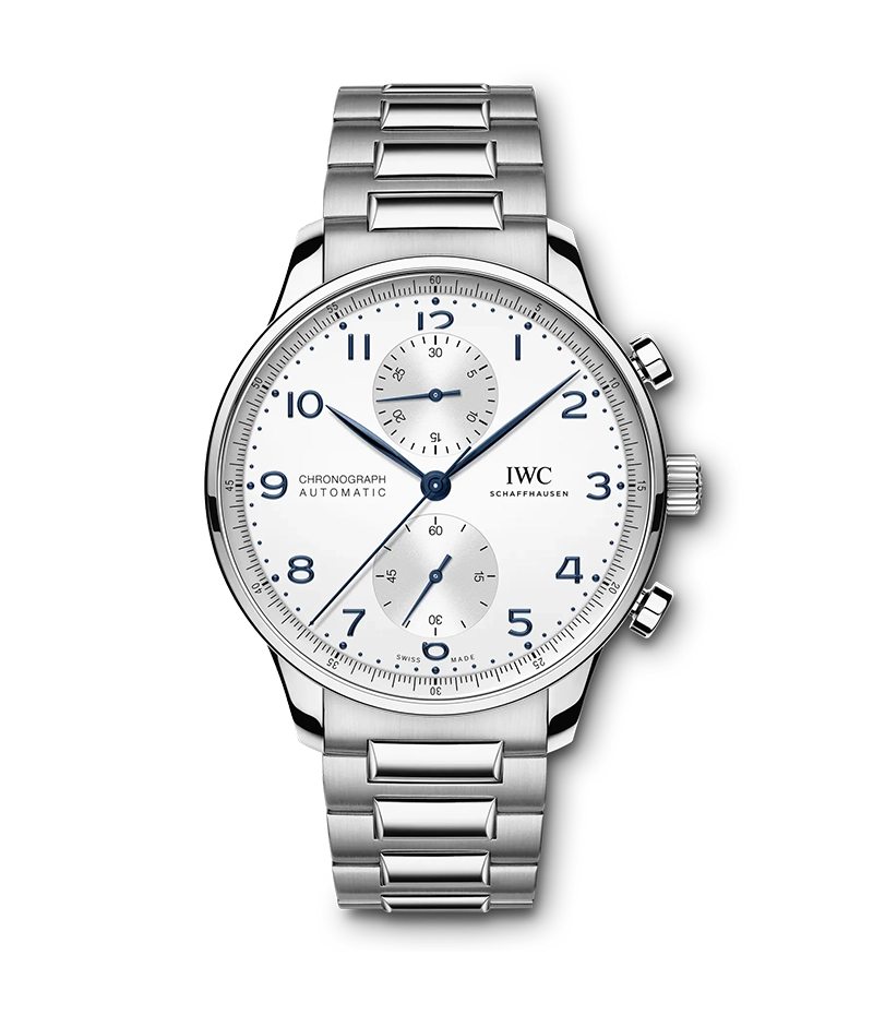 ステンレススチール製ケースにシルバーコーティングの文字盤、ブルーの針とアップライト・インデックスが組み合わされ、堅牢で耐食性に優れたブレスレットを備えたポルトギーゼ・クロノグラフは、これまで以上に幅広く活躍するパートナーとなります。