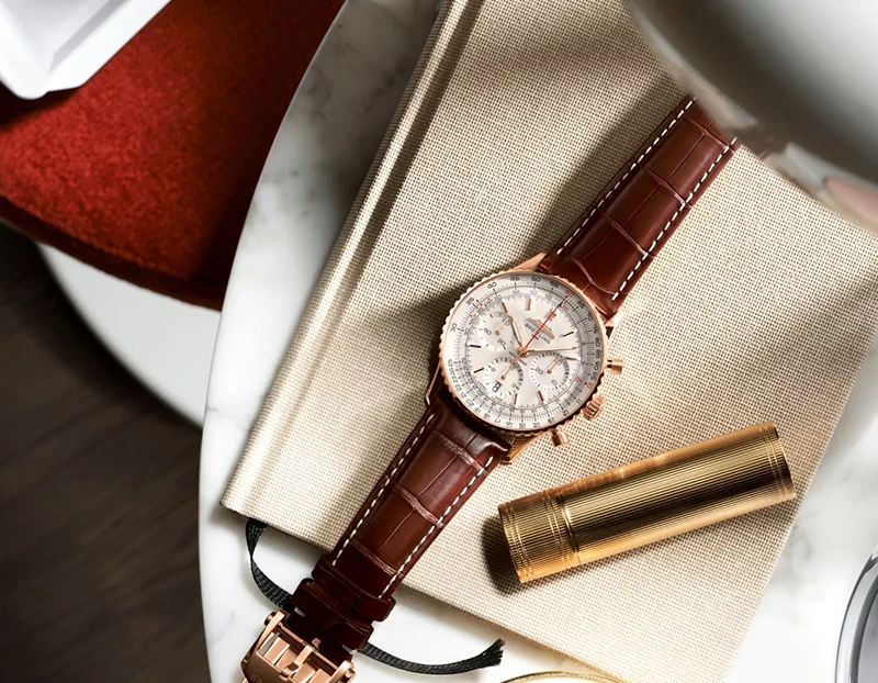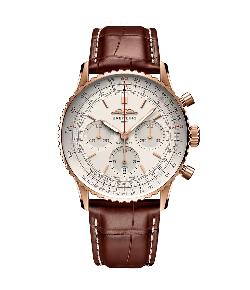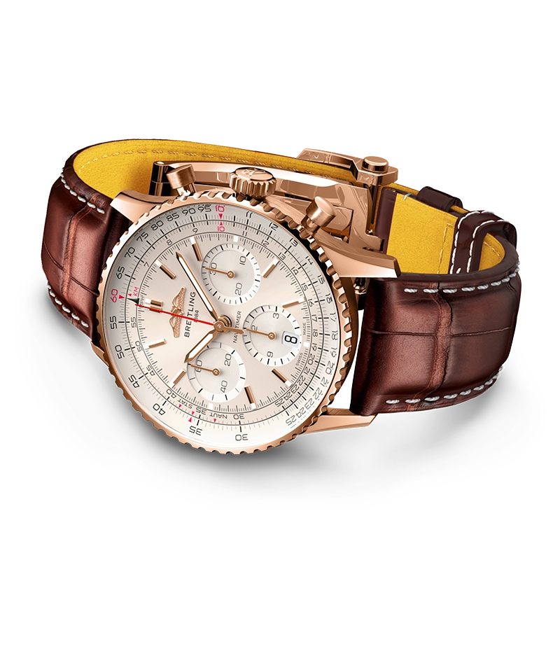 1952年の発売以来、ブライトリングのアイコンには数多くのモデルが製造されてきましたが、現在のナビタイマーはその最もクラシックな特徴を保ちながらも、現代に即した改良を加えています。平らにした回転計算尺とドーム型クリスタルで、よりスリムな外観を実現。ポリッシュとサテン仕上げを交互に施した金属部品を採用したことで、光沢を出しつつも控えめな印象に。そして、「AOPAの翼」が本来の12時位置に戻ったことも、ノスタルジーを喚起するアップデートと言えるでしょう。