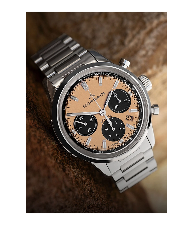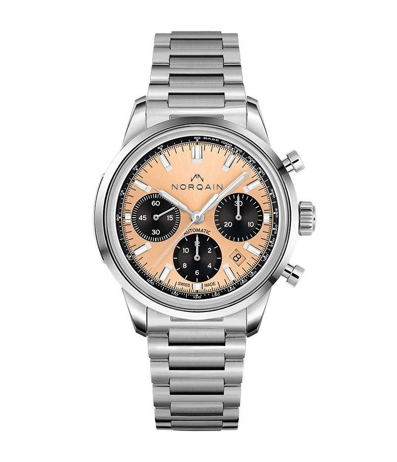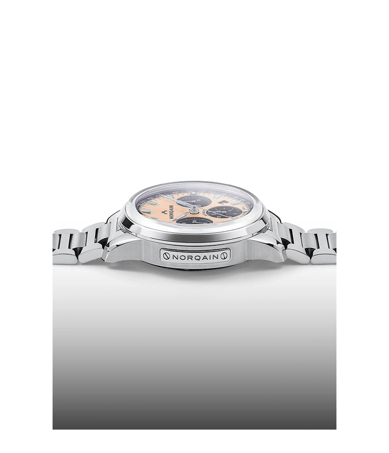 NORQAINのベストセラーモデルのバリエーションであるこのクロノグラフは、サンレイ仕上げのピーチ・レッドのトップダイアル、ブラックのサブダイアル、ホワイトのタキメータースケールを備えたブラックのアウターリングというユニークな2層ダイアルを備え、300本のみ生産されます。