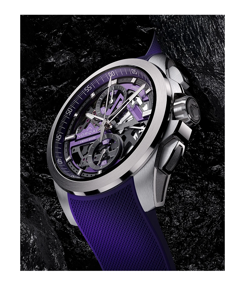 ノルケインとマニュファクチュールAMTのパートナーシップにより開発された新しいノルケイン 8Kマニュファクチュール キャリバー(NK24/1)。スケルトン加工されたフライバッククロノグラフは、「エイトサウザンダー」として知られる世界最高峰にインスパイアされたものです。