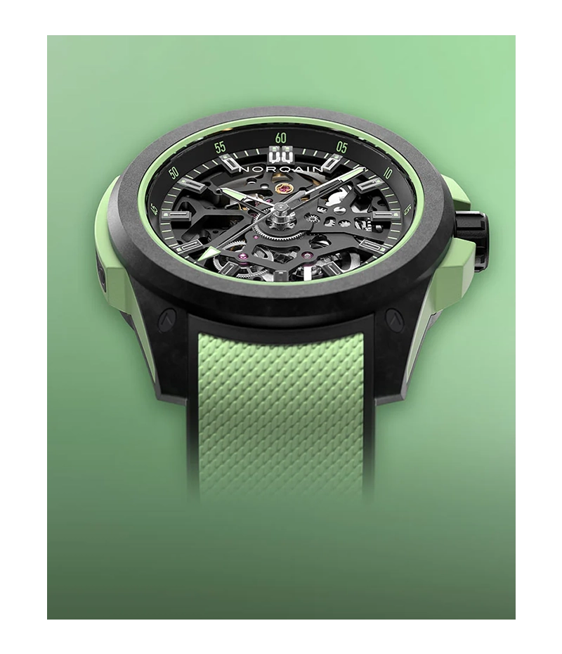 「Wild ONE 39mm」は、独自開発の超軽量かつ超高耐久のカーボン複合素材NORTEQ®を採用した、究極のスポーツウォッチです。機械式自動巻きスケルトンムーブメントを搭載し、その精巧なクラフトマンシップと精密なエンジニアリングを際立たせています。