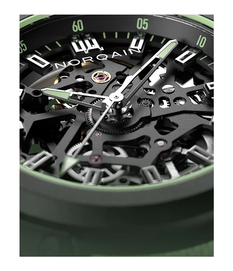 ノルケインのスケルトンムーブメントは、梁構造(ビーム構造)の建築原則に基づいた独自の設計を採用しています。各支点は最低でも2本のアームで補強されており、この革新的なデザインによって安定性と耐久性が向上。従来の構造と比べて、ムーブメント全体が格段に頑丈になり、過酷な環境下でも高い信頼性を発揮します。
