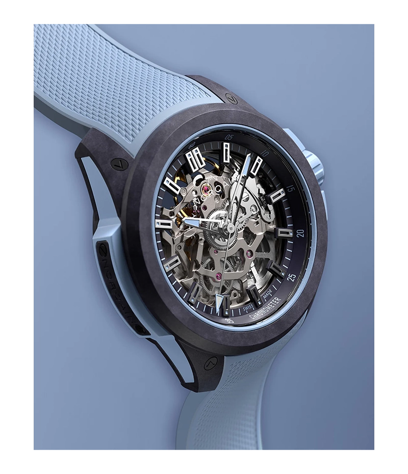 NORTEQ®カーボンファイバーコンポジットは、密度、弾力性、耐久性の完璧なバランスを実現し、衝撃吸収性能を最適化。ケースは、上下で独立したNORTEQ®パーツで構成され、特製のネジでしっかりと固定されたプロテクティブケージの役割を果たします。さらに、BIWI社製のラバーバンパーが衝撃を確実に吸収し、極限のアクティビティでも信頼できる耐久性を発揮します。ケース全体は25のパーツで構成されており、そのうちの4本のネジにはブランドの冒険心を象徴する山頂のデザインが刻まれています。