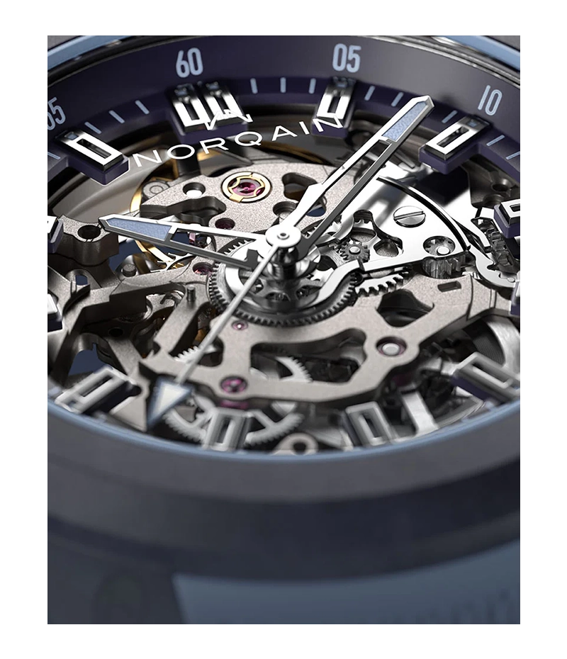 ノルケインのスケルトンムーブメントは、梁構造(ビーム構造)の建築原則に基づいた独自の設計を採用しています。各支点は最低でも2本のアームで補強されており、この革新的なデザインによって安定性と耐久性が向上。従来の構造と比べて、ムーブメント全体が格段に頑丈になり、過酷な環境下でも高い信頼性を発揮します。