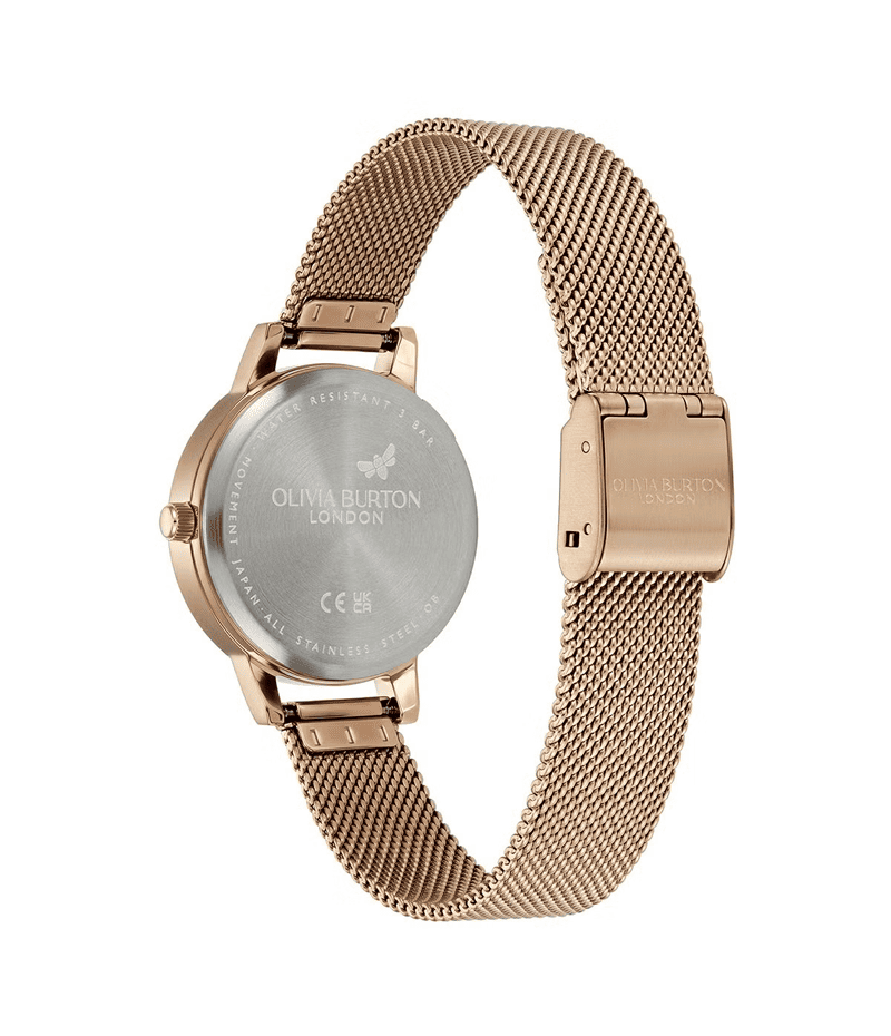 控えめなフローラルデザインが魅力の抽象的な文字盤。手描きの花々が織りなすマーブル模様に、繊細なメタリックエッチングがアクセントを添えています。スリムなケースとローズゴールド仕上げの洗練されたメッシュストラップが調和し、いつでもエレガントなスタイルを演出します。