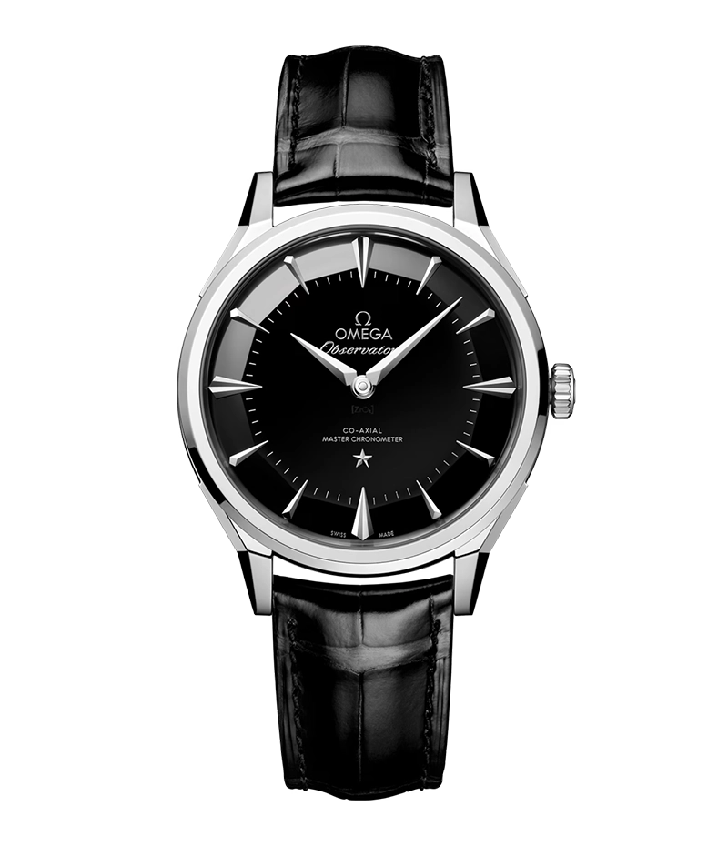 この、ケース直径39.4mmのポリッシュ仕上げ&ブラッシュ仕上げ「O-MEGAスティール」製モデルは、面取りを施した“ドッグレッグ”ラグと、クリアカットのファセットをつけたベゼルを備えたデザイン。ポリッシュ仕上げのバックルが付いた光沢のあるブラックのレザーストラップが合わせられています。