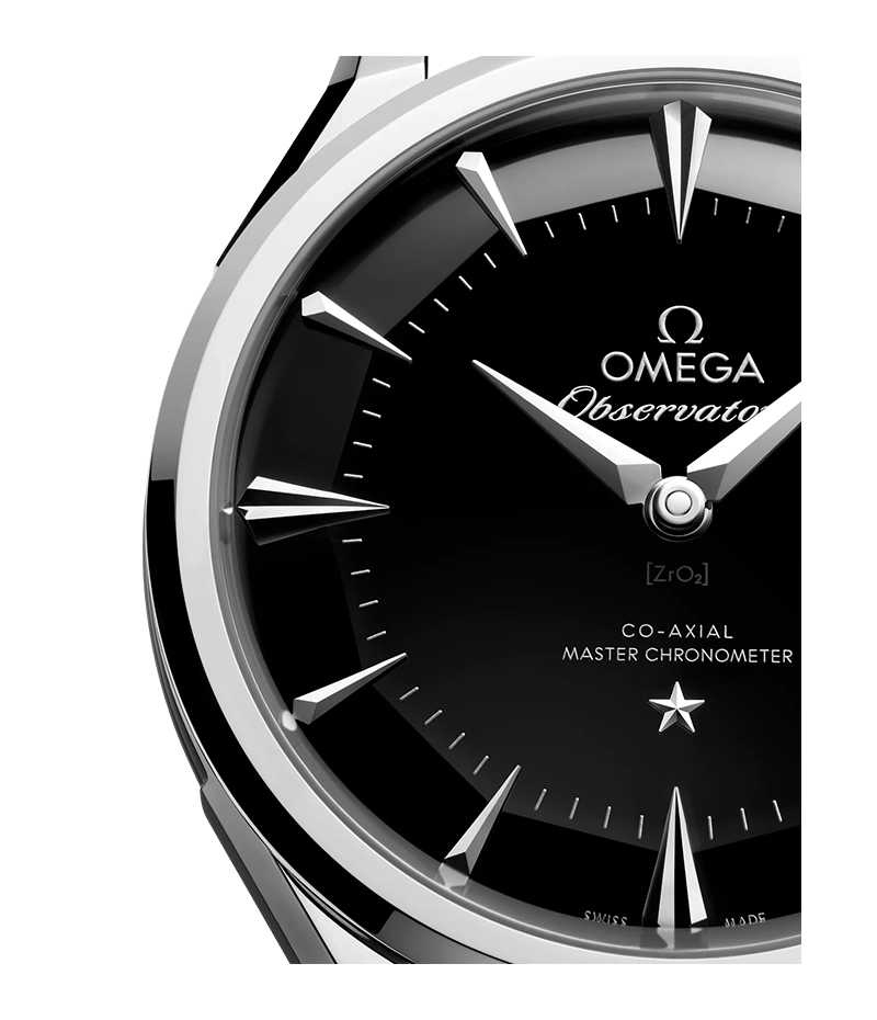 1952年に発表された「コンステレーション」を思わせる、12角形のファセットが施された“パイパン”ダイアルに、オメガロゴの転写と「コンステレーション」の星があしらわれています。ブラックのセラミック製ダイアルには、中央部にポリッシュ仕上げが施され、溝のないファセットがつけられています。(*パイを焼くフライパンの形状に由来)
