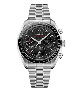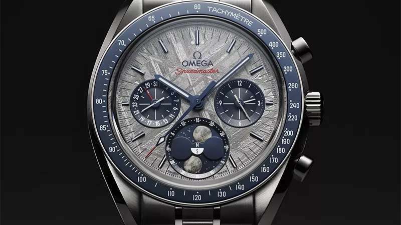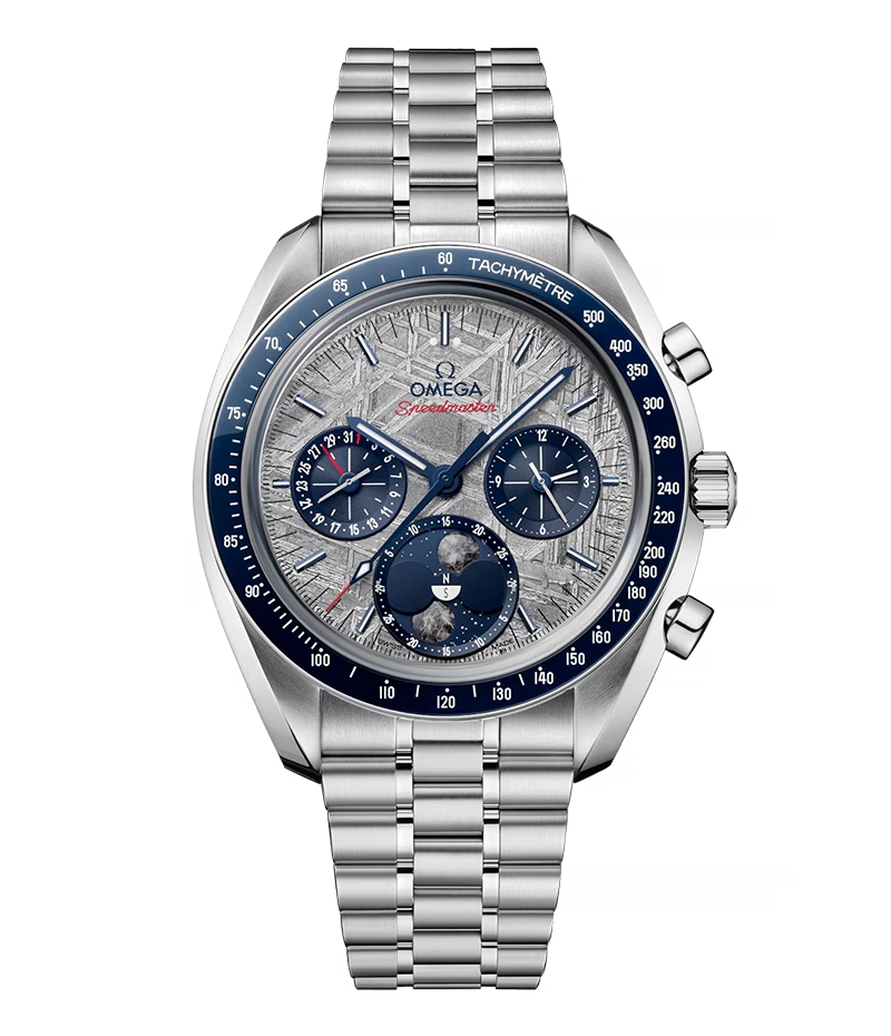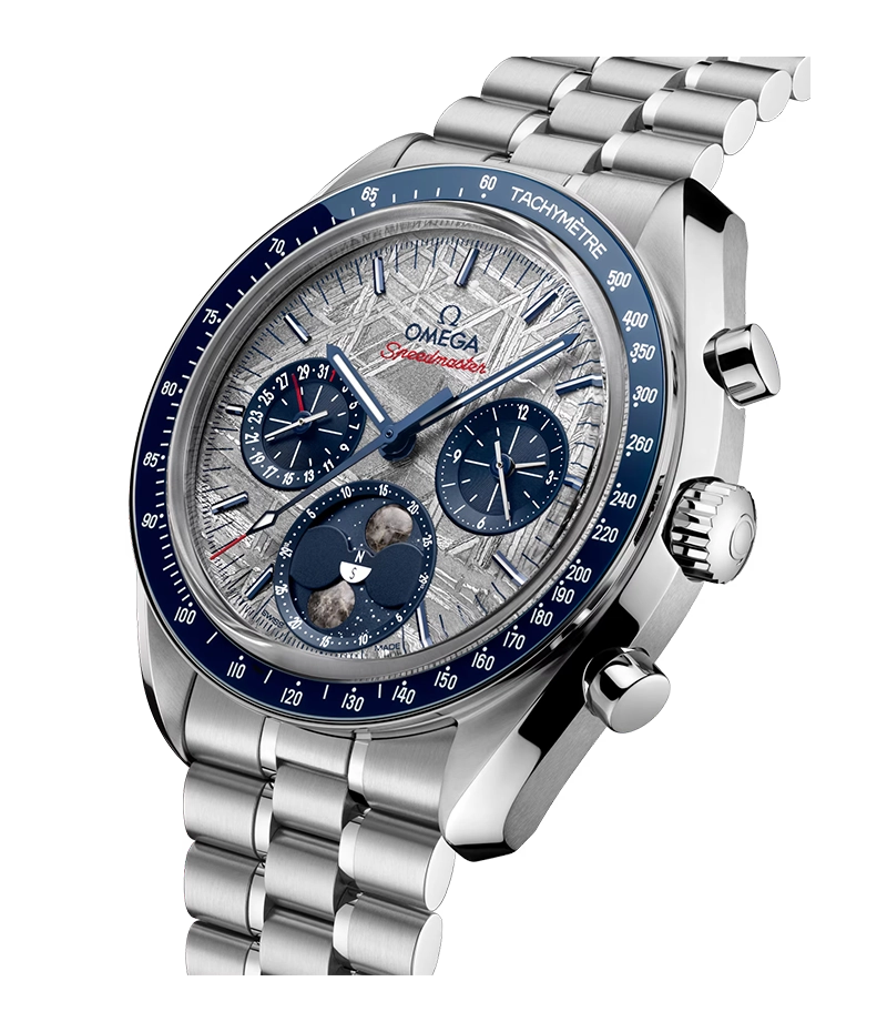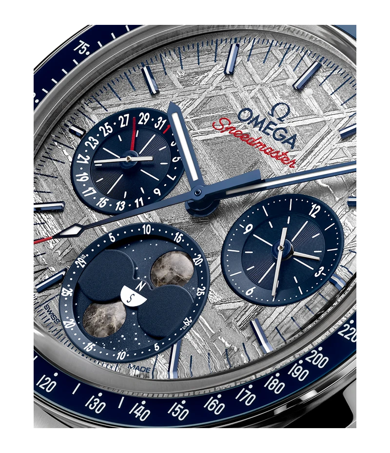 「オメガ スピードマスター」は、1969年のアポロ11号をはじめ、歴史上のすべて(6度)に渡る月面着陸プロジェクトに携帯された、オメガを代表するタイムピースのひとつです。本物の月隕石から作られたふたつの月を備える、ケース径43mmのムーンフェイズウォッチは、その比類のない歴史を讃えるオマージュです。