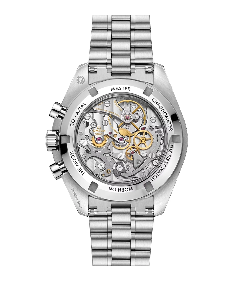 技術的偉業である「キャリバー3861」は、月面で使用された最初の時計の後継ムーブメントです。ムーンウォッチに搭載された初の「コーアクシャル マスター クロノメーター」であり、高いパワーリザーブ、クロノメーター性能、15,000ガウスの耐磁性能を備えています。フリースプラングテンプにシリコン製ヒゲゼンマイ。ロジウム仕上げと、ブリッジにストレートのジュネーブウェーブ装飾が施されます。