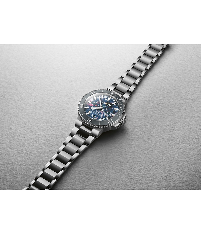 アクイスデイト41.50㎜アップサイクルは、ポジティブな変化のシンボルとしてあなたのお供をします。より良い変化をもたらす活動の一環として海洋環境保全のメッセージを伝えるリサイクルPET製の文字盤は、二つとして同じものがありません。