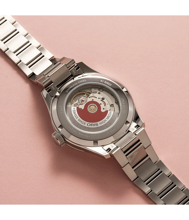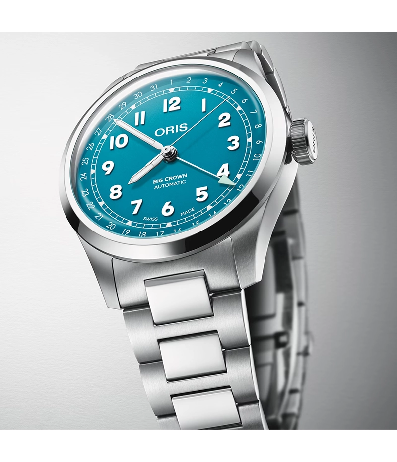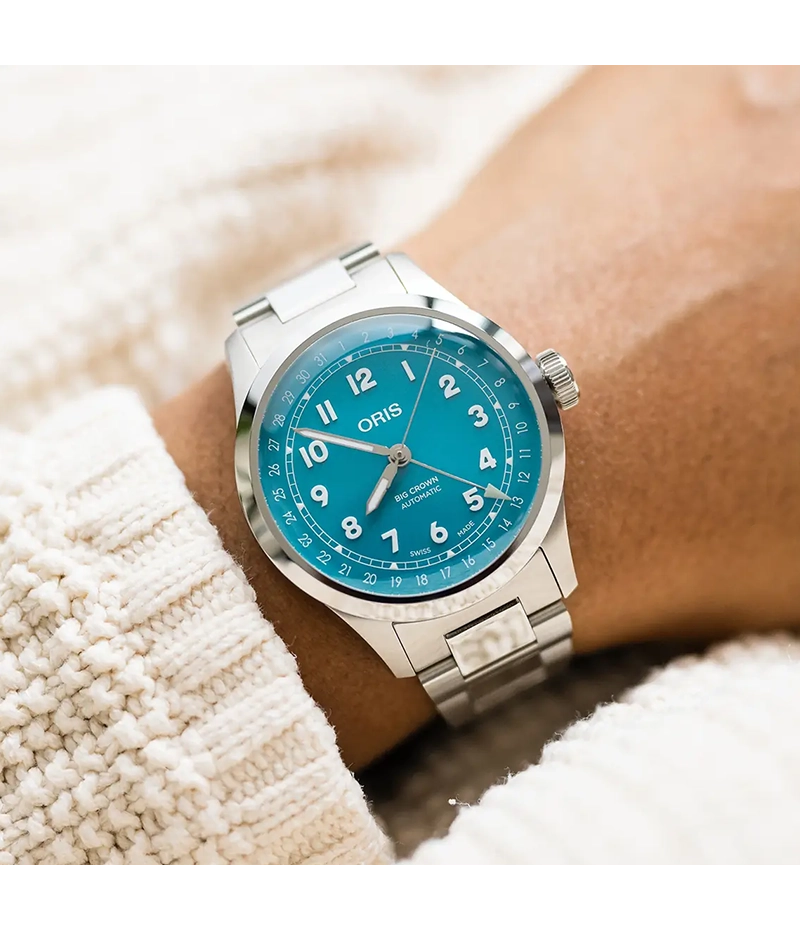 直径40mmの鮮やかなターコイズブルーが美しいダイヤル。直径40mmのステンレススチールケースにはHリンクブレスレットを採用しています。Oris開発のクラスプはまるで着けていることを忘れるような心地です。