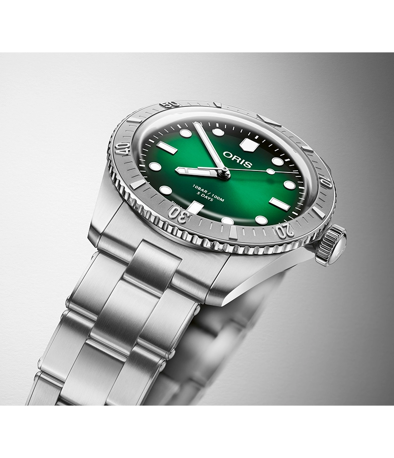 オリスファンからの熱い要望に応えて、ダイバーズ65に「キャリバー400」を搭載した、日付表示なしのモデル。38ミリステンレススチールケースに日付表示のないグリーン文字盤とレリーフの回転ベゼルをセットし、1960年代のレトロさを感じながらもエイジレスなスポーツウォッチです。