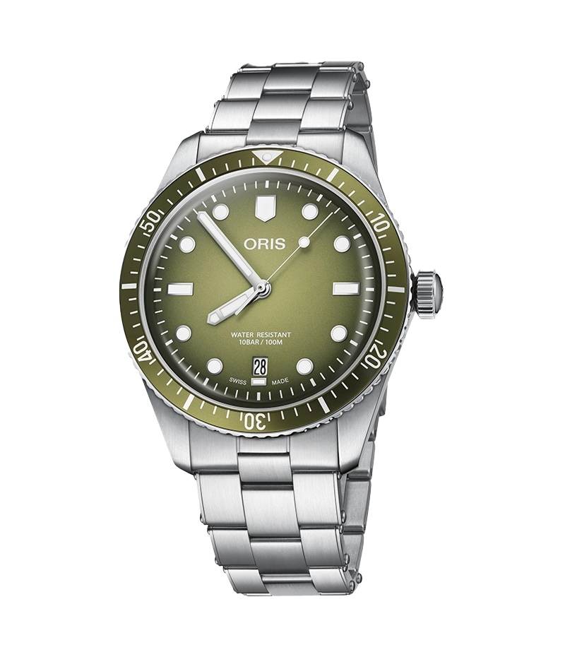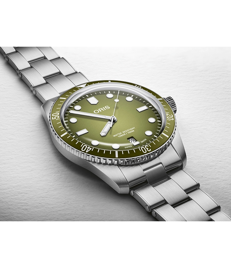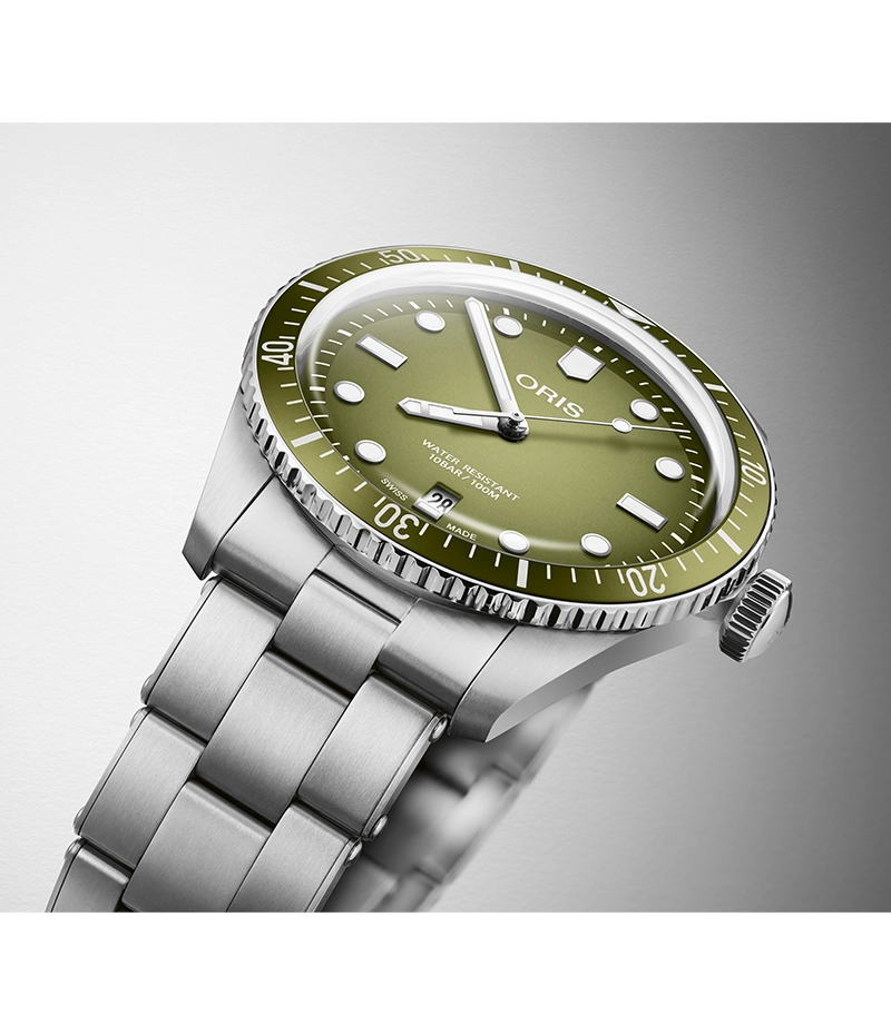 オリスの工場から見える木々と同様、このダイバーズ65のグリーンは単色ではありません。美しい渓谷の奥行あるグリーンを表現した、グラデーションを施しています。40㎜のスチールケースの中身は、スイス製自動巻ムーブメントです。