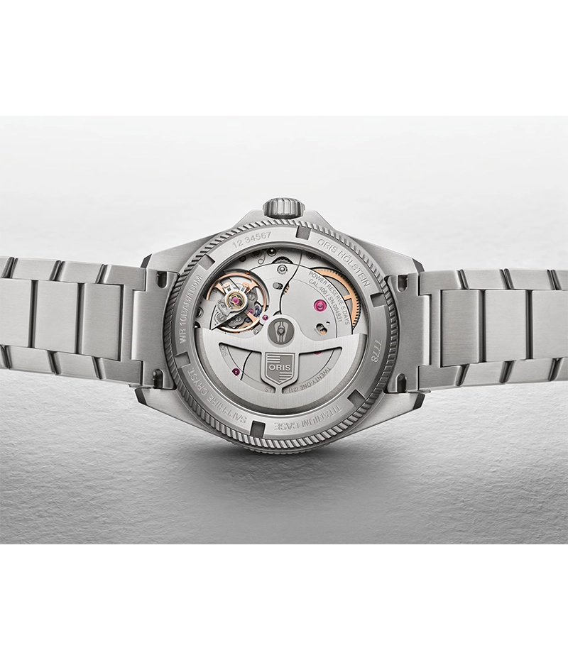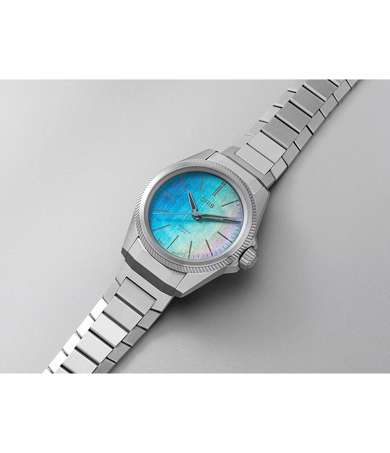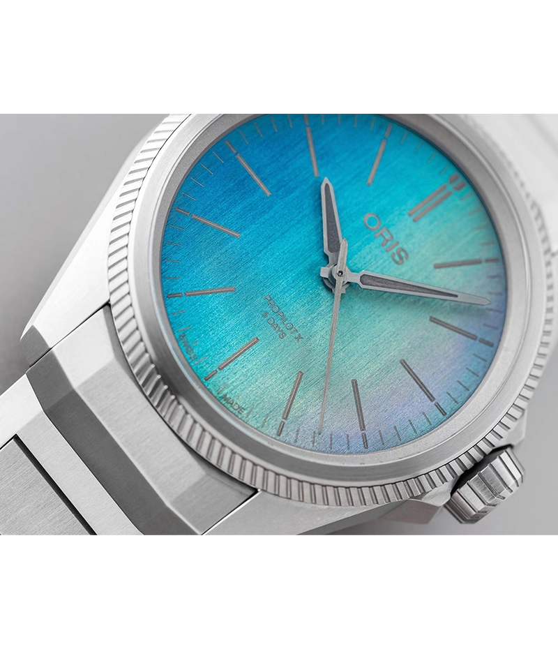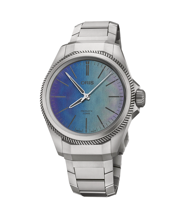 新作プロパイロットXキャリバー400レーザーの独特なダイアルに採用した光の反射で複雑な色を表現する最新鋭の技術は、自然界の玉虫色から発想を得た生物模倣の原理で、自然界の不思議をテクノロジーに反映したものです。信じられないかもしれませんが、万華鏡のような仕上げのダイアルには色素は一切使われていません。オリスのロゴをはじめとするディテールもレーザーで加工したものです。テクノロジーによる美の表現です。