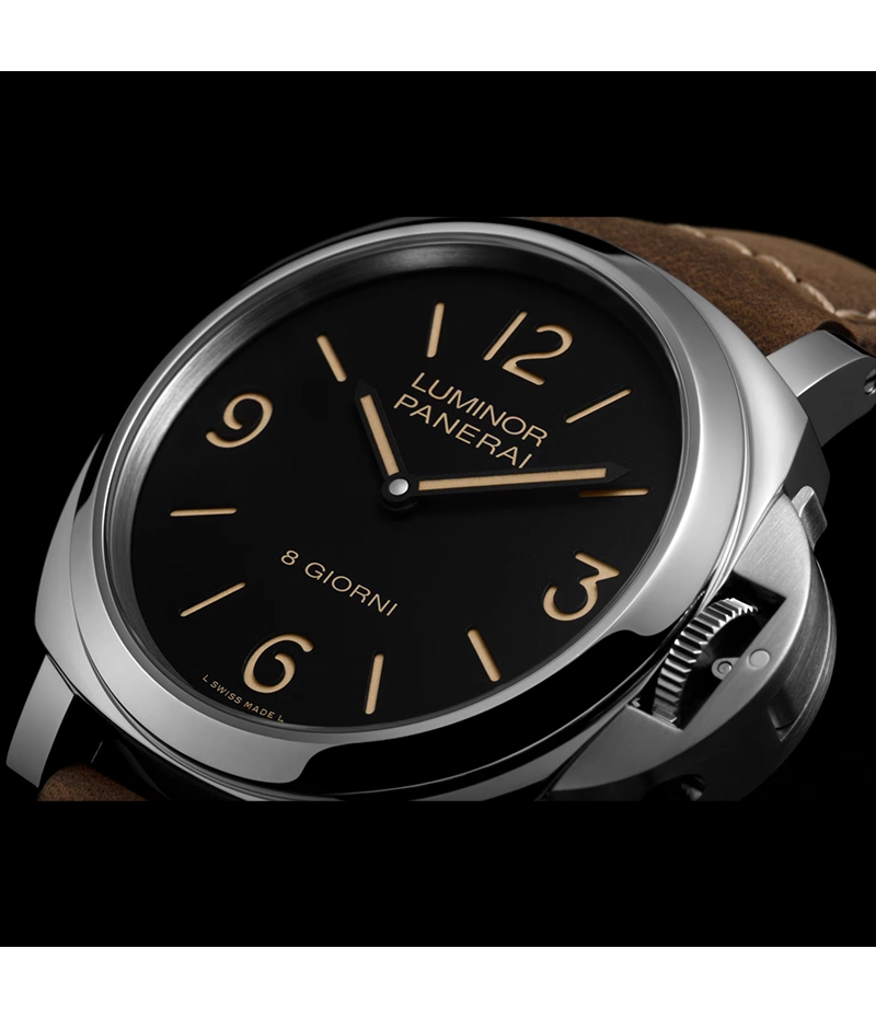 「ルミノール 8 ジョルニ」の文字盤は伝統のサンドイッチ式を採用し、6時位置の「8 GIORNI」はイタリア語で8日を意味します。