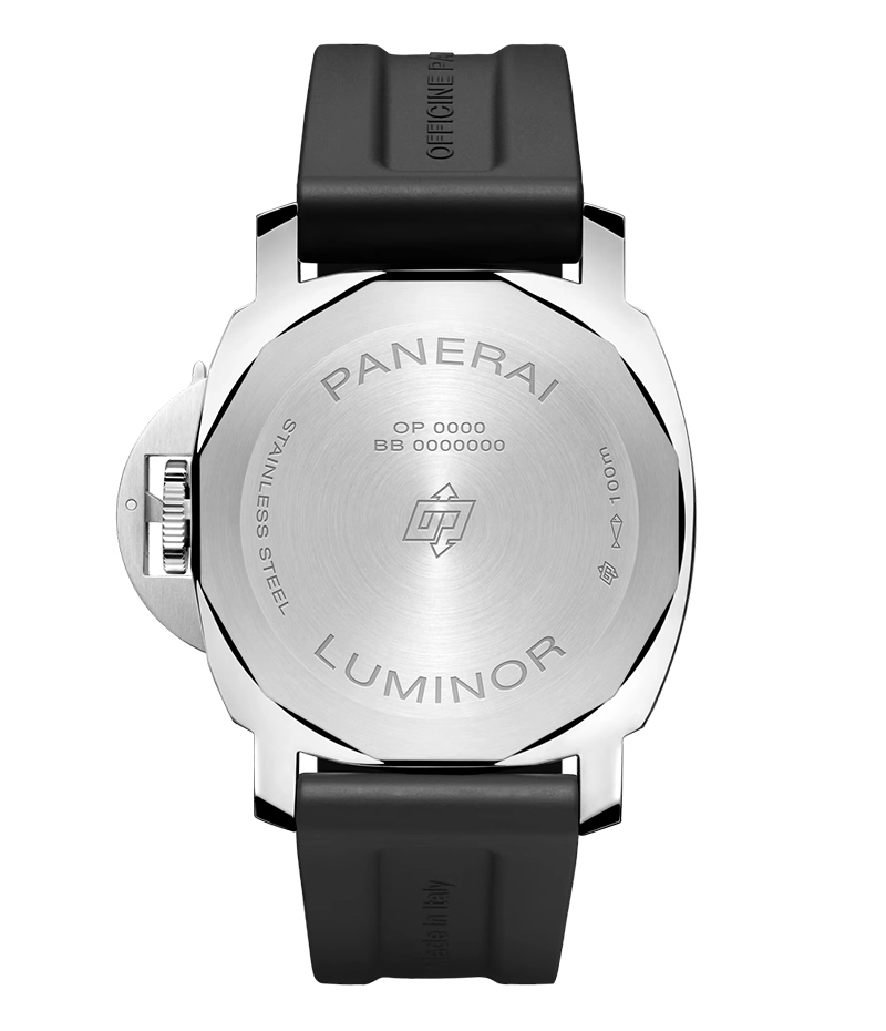 人目を惹き付ける、ミニマルなデザインのスポーツウォッチであるため、このモデルの唯一の装飾的要素はダイアル上の「OPのロゴ」のみとなっており、その他のディテールはすべてパネライの伝統に忠実に、機能性のみを備えたものになっています。