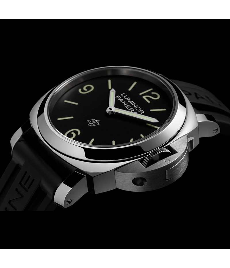 ルミノールのケースは、ユニークなレバー付きのブリッジ型「リュウズプロテクター」によってその形が特徴づけられています。「ルミノール ロゴ」のクリーンかつ独特なラインは、1990年代の初の民間向けモデルからインスピレーションを得ています。