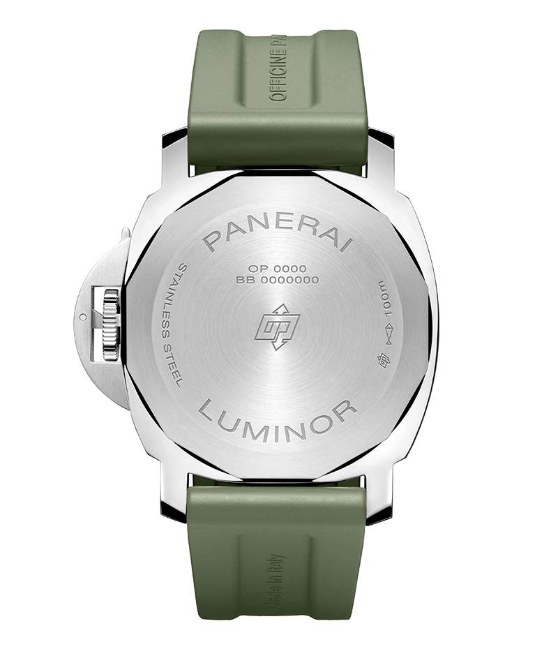 人目を惹き付ける、ミニマルなデザインのスポーツウォッチであるため、このモデルの唯一の装飾的要素はダイアル上の「OPのロゴ」のみとなっており、その他のディテールはすべてパネライの伝統に忠実に、機能性のみを備えたものになっています。
