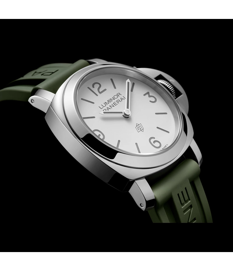 ルミノールのケースは、ユニークなレバー付きのブリッジ型「リュウズプロテクター」によってその形が特徴づけられています。「ルミノール ロゴ」のクリーンかつ独特なラインは、1990年代の初の民間向けモデルからインスピレーションを得ています。