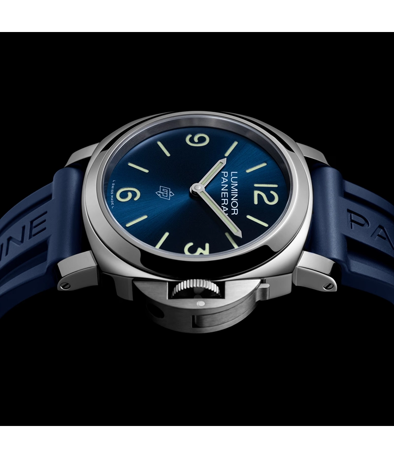 ルミノールのケースは、ユニークなレバー付きのブリッジ型「リュウズプロテクター」によってその形が特徴づけられています。「ルミノール ロゴ」のクリーンかつ独特なラインは、1990年代の初の民間向けモデルからインスピレーションを得ています。