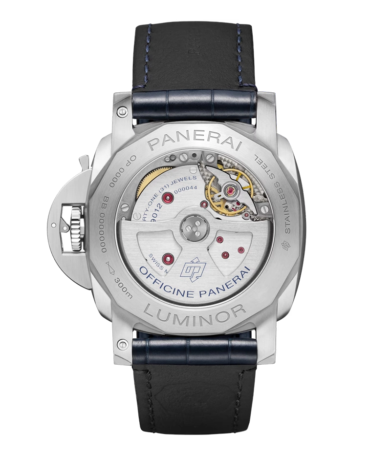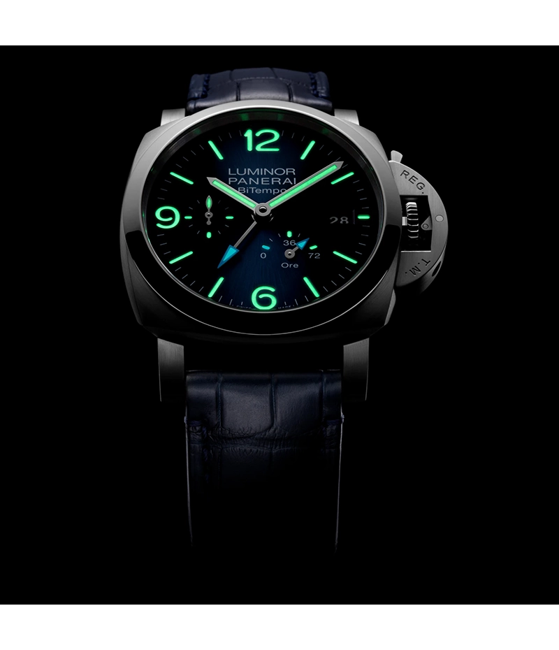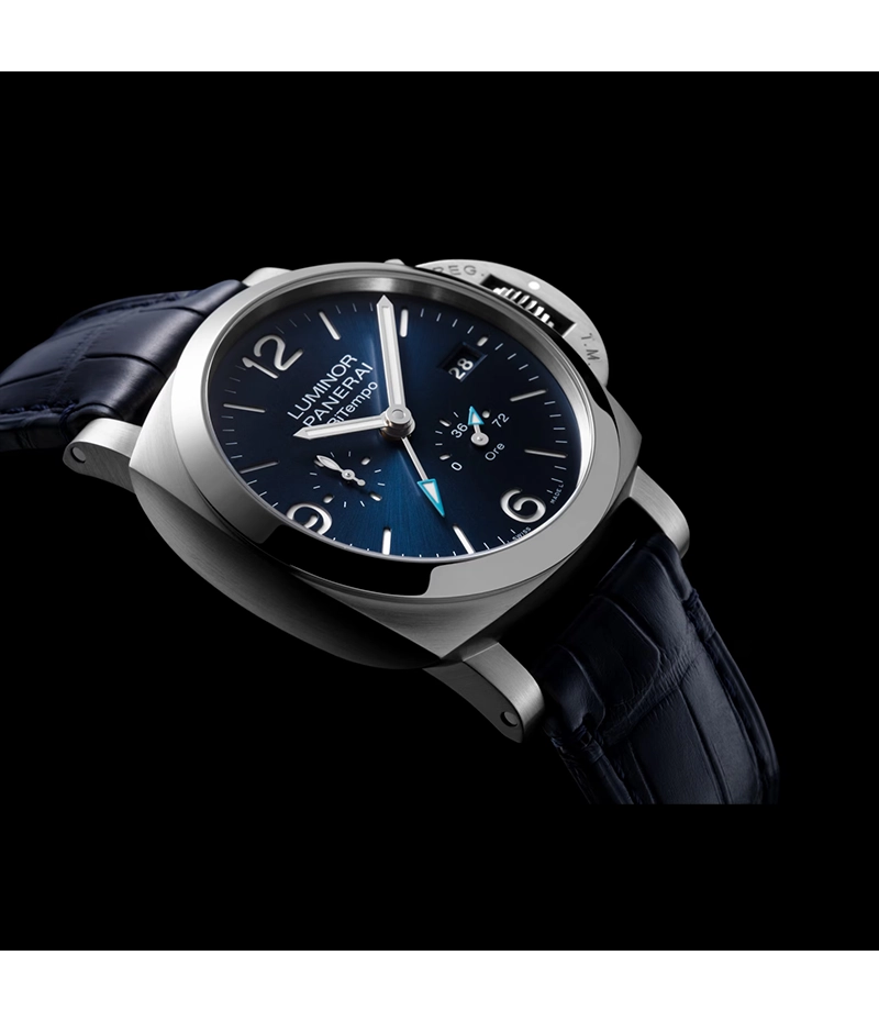 「ルミノール ビテンポ パワーリザーブ」は、洗練されたデザインのGMT表示により、時差のあるふたつの異なる地域の時間を同時に表示できます。GMT表示は、一目でわかる鮮やかなセルリアンブルーの針の採用で、夜中でも第2時間帯の時刻確認が容易です。