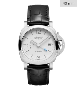 「ルミノール マリーナ」を象徴するテクノロジーとスタイルである、クッション型ケースや、「REG. T.M.」の登録商標が刻印された特徴的なレバーロック式の「リュウズプロテクター」などを継承し、GMT機構を搭載したケースサイズ40mmのバージョンです。