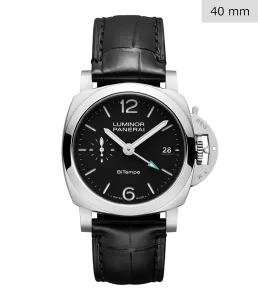 「ルミノール マリーナ」を象徴するテクノロジーとスタイルである、クッション型ケースや、「REG. T.M.」の登録商標が刻印された特徴的なレバーロック式の「リュウズプロテクター」などを継承し、GMT機構を搭載したケースサイズ40mmのバージョンです。
