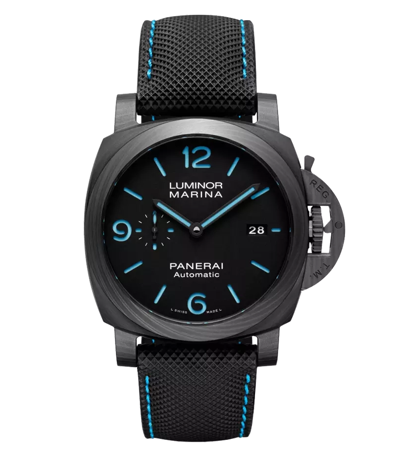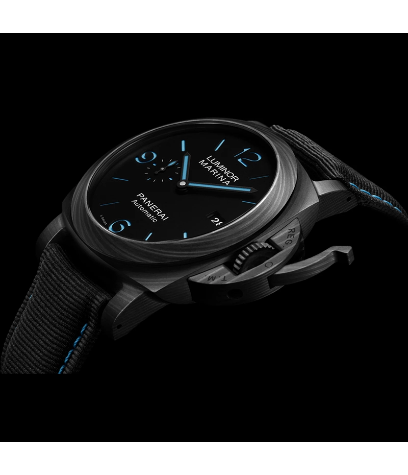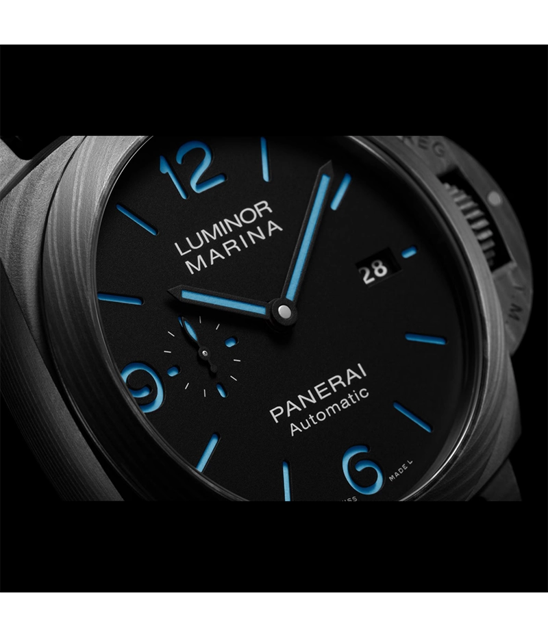 このモデルのケースに用いられる「パネライ カーボテック™」は、パネライの豊富なラインナップの中で最も軽量な素材です。 高性能のロングカーボンファイバーで作られた複合構造を備えたこの素材は、特徴的なデザインで、個々の時計に独特の個性を与えます。
