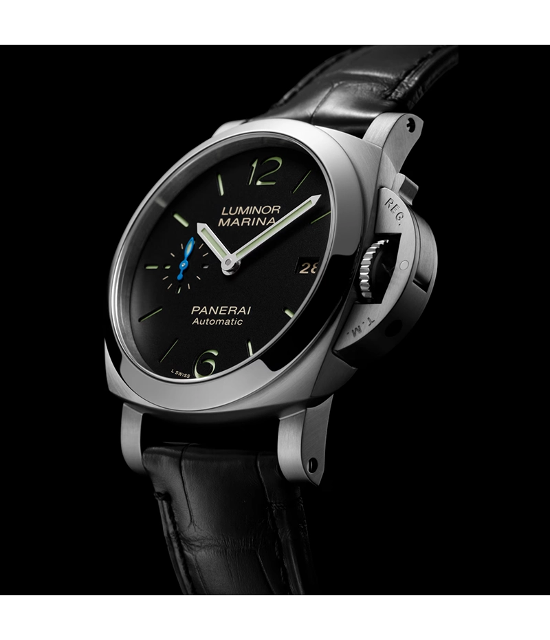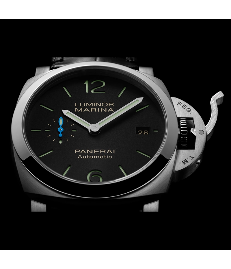 ルミノール マリーナを象徴するテクノロジーとスタイルである、クッション型ケースや、「REG. T.M.」の登録商標が刻印された特徴的なレバーロック式の「リュウズプロテクター」などを継承した、ケースサイズ40mmのバージョンが「ルミノール マリーナ クアランタ」です。