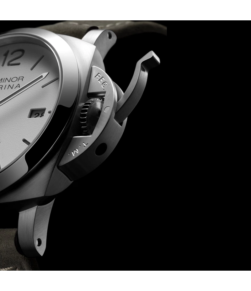 パネライが特許を取得した、レバーでリューズを保護する装置「リューズプロテクター」は、「REG.T.M.」と登録商標が刻印され、ブランドの特徴的なシンボルとなっています。 ケースの防水性を確保するために設計されており、取り扱いの誤りや破損からリュウズを保護します。