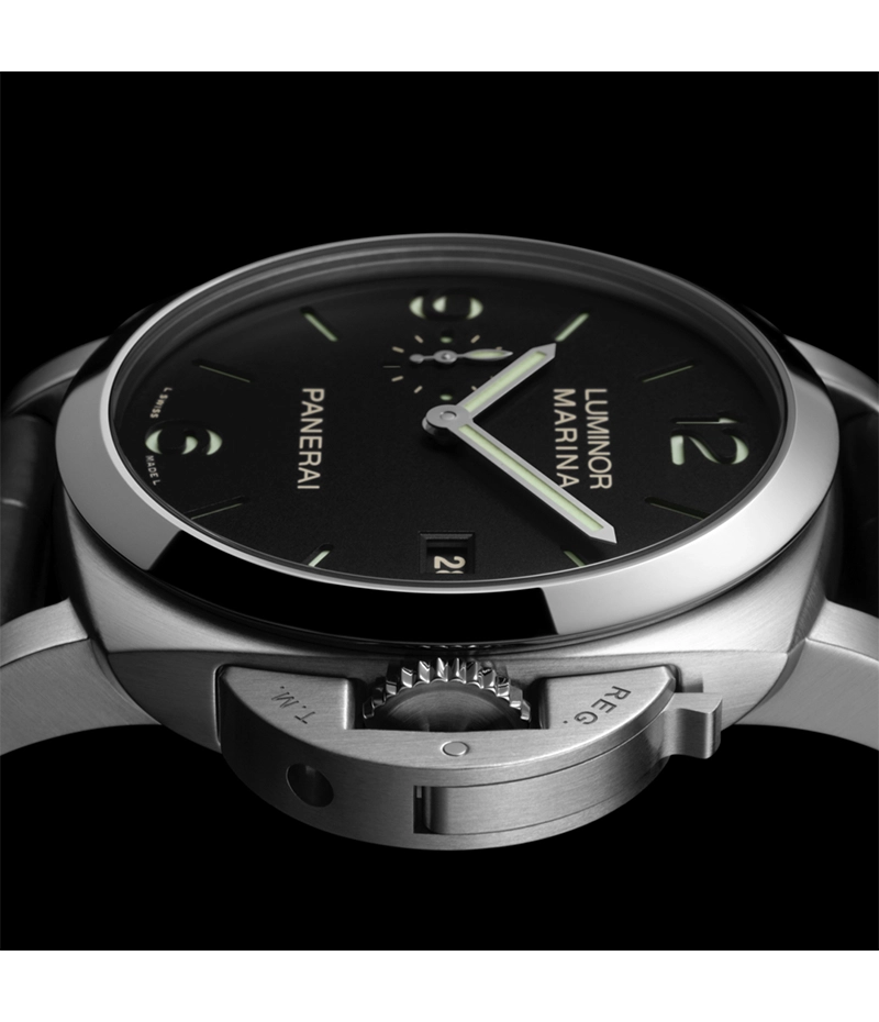 パネライが特許を取得した、レバーでリュウズを保護する装置は、「REG.T.M.」と登録商標が刻印され、ブランドの特徴的なシンボルとなっています。ケースの防水性を確保するために設計されており、取り扱いの誤りや破損からリュウズを保護します。