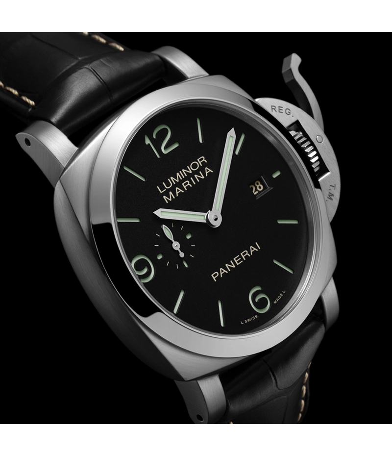高い視認性を実現するため、ルミノールの文字盤のデザインは非常にミニマルなものとなっており、四方点に大きなアラビア数字が配され、アワーインデックスには夜光素材が塗布されています。9時位置のスモールセコンド表示は、パネライの多くの時計、特にルミノール マリーナの一目でわかる要素で、特殊部隊が作戦と時計を完璧に同期させる必要性から生まれました。