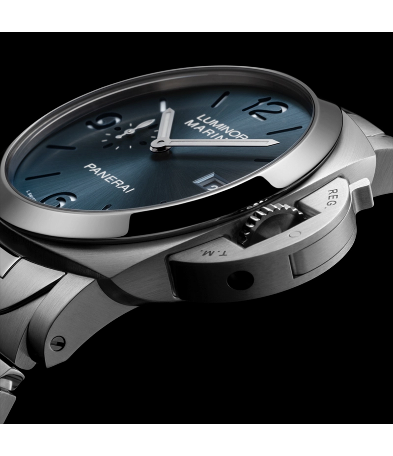 パネライが特許を取得した、レバーでリュウズを保護する装置は、「REG.T.M.」と登録商標が刻印され、ブランドの特徴的なシンボルとなっています。ケースの防水性を確保するために設計されており、取り扱いの誤りや破損からリュウズを保護します。