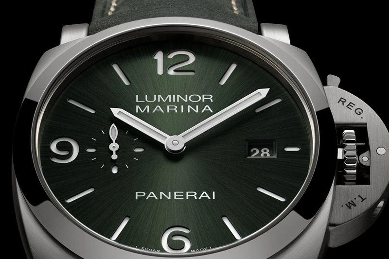高い視認性を実現するため、ルミノールの文字盤のデザインは非常にミニマルなものとなっており、四方点に大きなアラビア数字が配され、アワーインデックスには夜光素材が塗布されています。9時位置のスモールセコンド表示は、パネライの多くの時計、特にルミノール マリーナの一目でわかる要素で、特殊部隊が作戦と時計を完璧に同期させる必要性から生まれました。