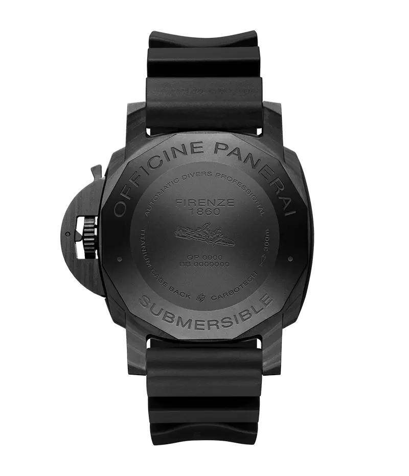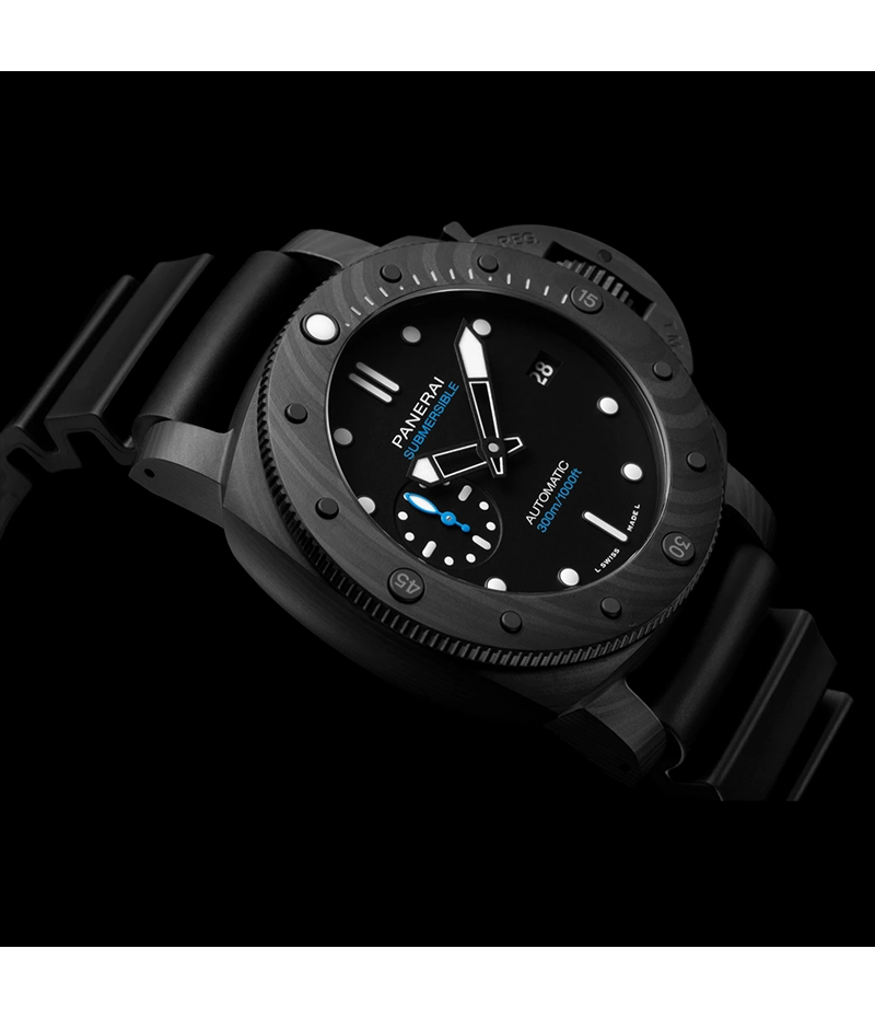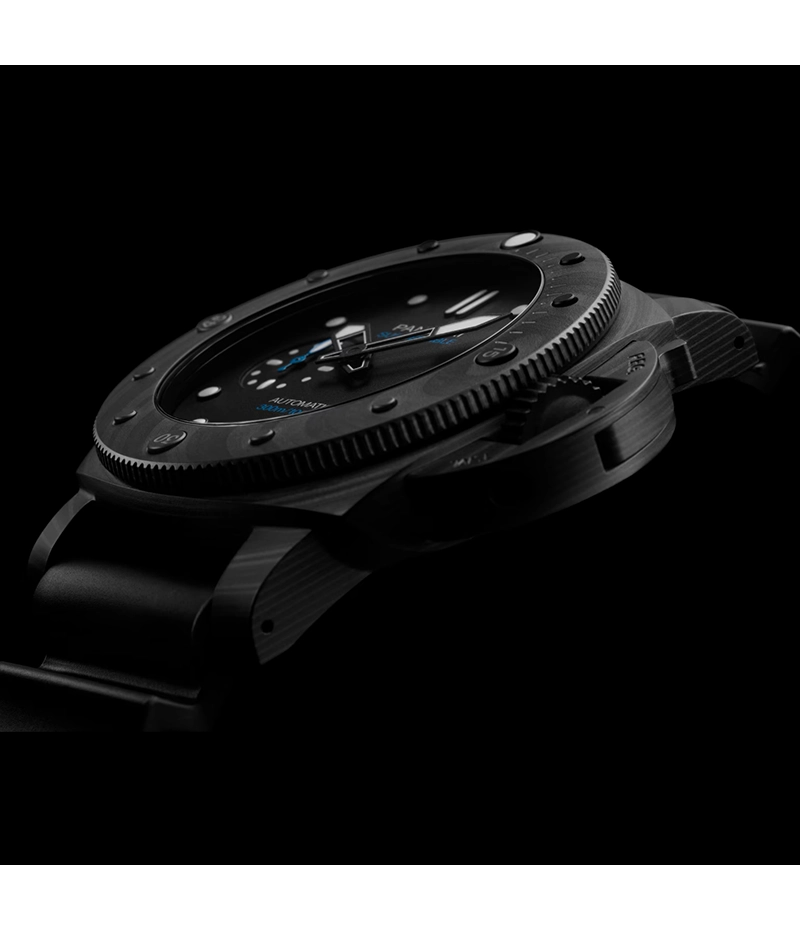 このモデルのケースに用いられる「パネライ カーボテック™」は、パネライの豊富なラインナップの中で最も軽量な素材です。高性能のロングカーボンファイバーで作られた複合構造を備えたこの素材は、特徴的なデザインで、個々の時計に独特の個性を与えます。また、インデックスと大きなスケルトン針には個性的なブルーのスーパールミノヴァ®が塗布されており、暗闇でも優れた視認性を保証します。