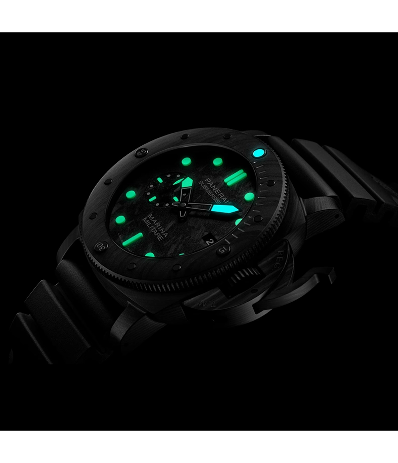 このモデルのケースに用いられる「パネライ カーボテック™」は、パネライの豊富なラインナップの中で最も軽量な素材です。高性能のロングカーボンファイバーで作られた複合構造を備えたこの素材は、特徴的なデザインで、個々の時計に独特の個性を与えます。
