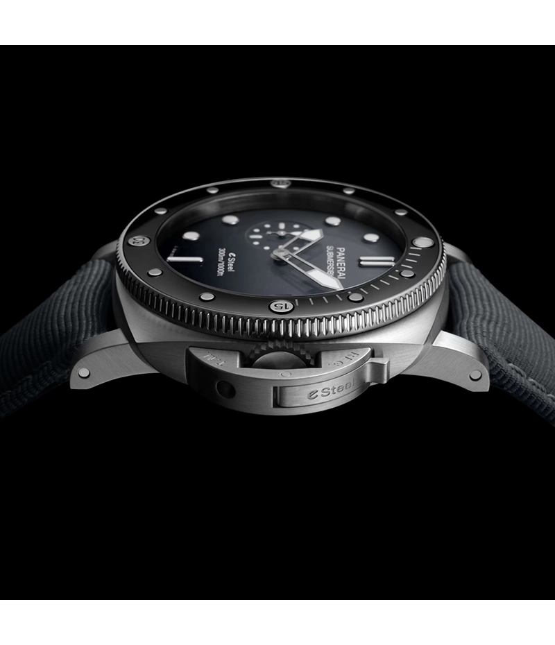 「eスチール™」は化学的性質を含め、物理的構造、耐食性など、従来のスティールと同じ金属特性を備えており、ダイビングウォッチの象徴的なコレクションであるサブマーシブルにふさわしい素材です。特徴的なパーツであるリュウズプロテクターのレバー部分と、文字盤にはeSteel™の文字が刻まれています。
