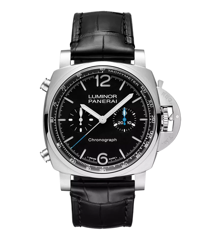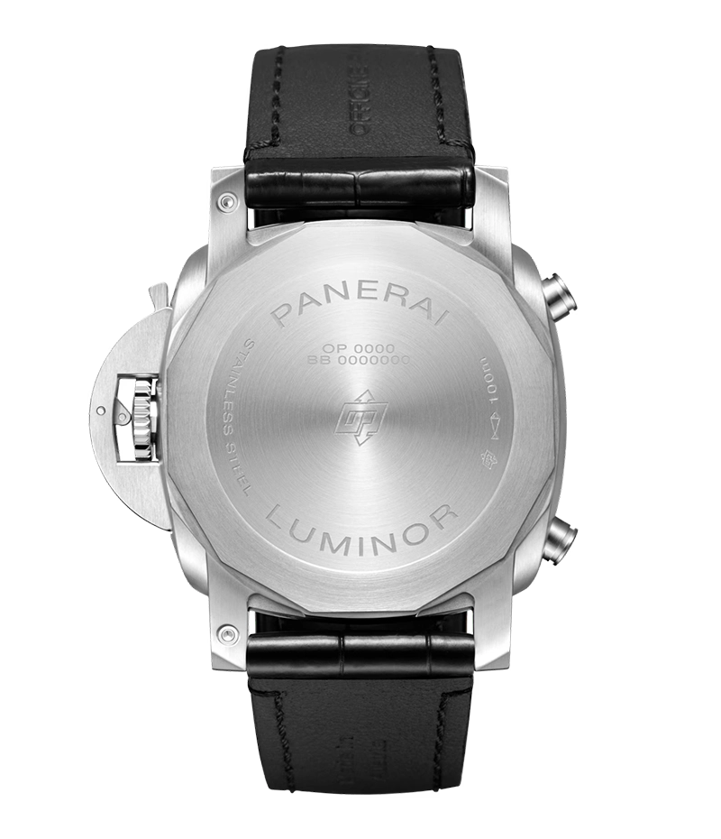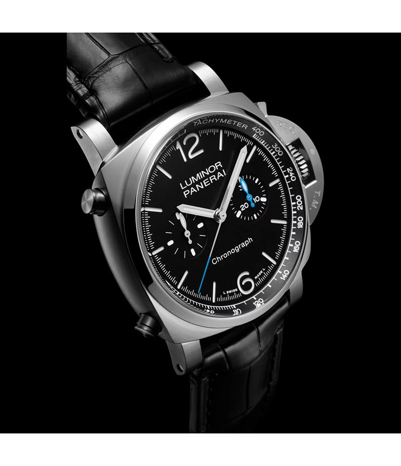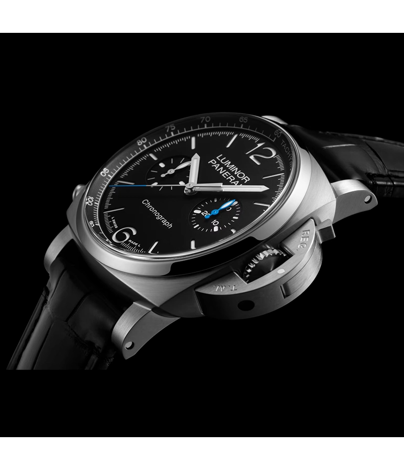 パネライの真髄である「サンドイッチダイアル」、そして「リューズプロテクター」をケースの右側に配置したルミノール クロノは、左側でクロノグラフを操作します。突出したフランジ上の「ベース 1000」タキメータースケールによって、あらかじめ設定された距離における平均速度をキロメートルまたはマイルで計算することができます。