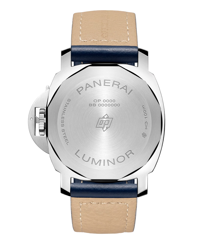 人目を惹き付ける、ミニマルなデザインのスポーツウォッチであるため、このモデルの唯一の装飾的要素はダイアル上の「OPのロゴ」のみとなっており、その他のディテールはすべてパネライの伝統に忠実に、機能性のみを備えたものになっています。