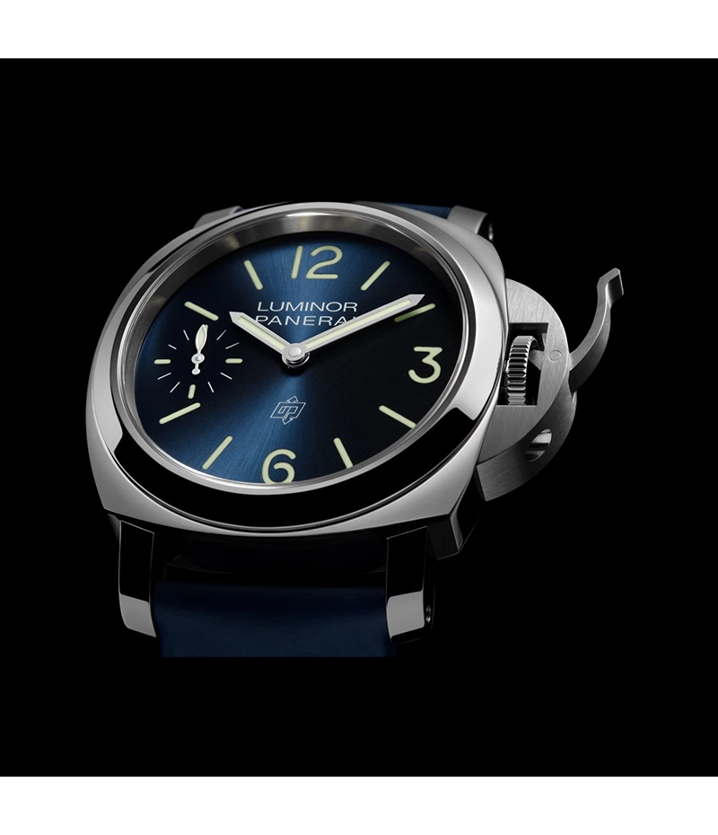 ルミノールのケースは、ユニークなレバー付きのブリッジ型「リュウズプロテクター」によってその形が特徴づけられています。「ルミノール ロゴ」のクリーンかつ独特なラインは、1990年代の初の民間向けモデルからインスピレーションを得ています。