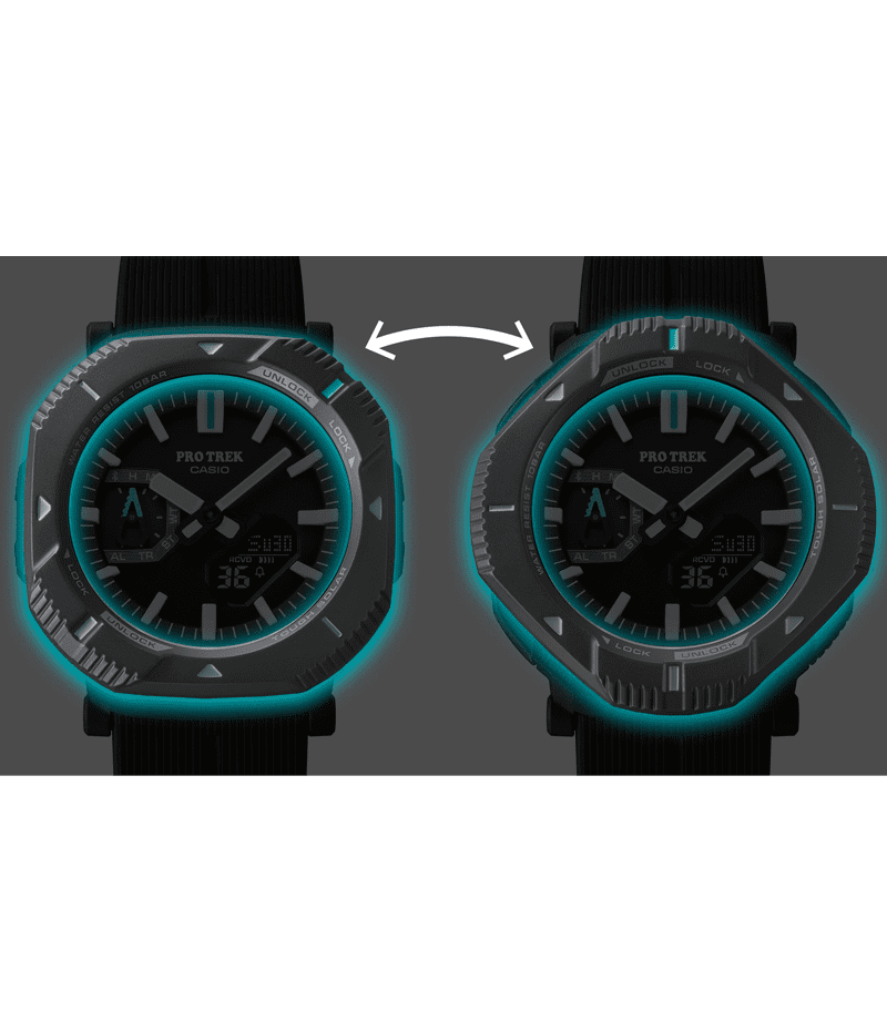 このモデルはロータリーガードベゼルを初採用。このベゼルを回すことで、2つのスタイルに切り替えることができます。