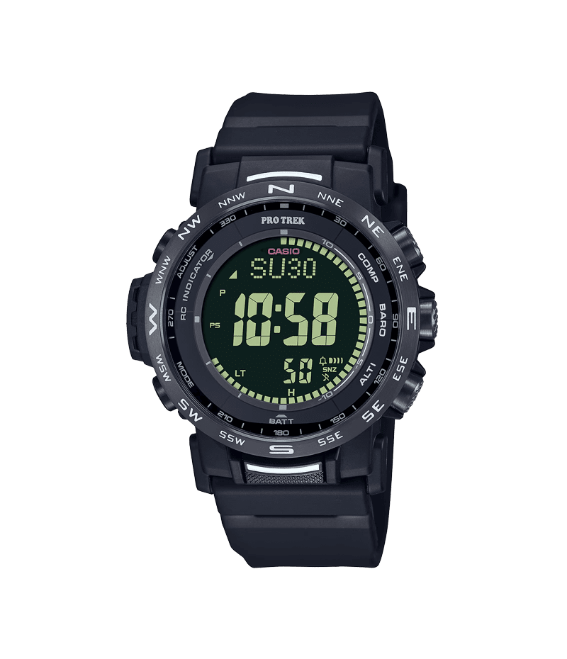 自然を愛する人の本格アウトドアギアPRO TREKクライマーライン。本モデルは環境に配慮されたエコ素材を採用し、直感的な操作が可能なデジタルウオッチです。 ソフトウレタンバンドやケース、樹脂製の裏蓋にバイオマスプラスチックを使用。また、蒸れを防ぐスリット穴を設け腕への装着性を向上しました。 大型のダイレクトボタンにより、方位、気圧/温度、高度をワンプッシュで直感的に計測、把握できます。また、STN液晶やボールドフォントを採用し、視認性を向上させています。 計測機能に加えタフソーラーや電波受信機能、10気圧防水等の基本性能も搭載し、過酷なアウトドアシーンでも使用できます。