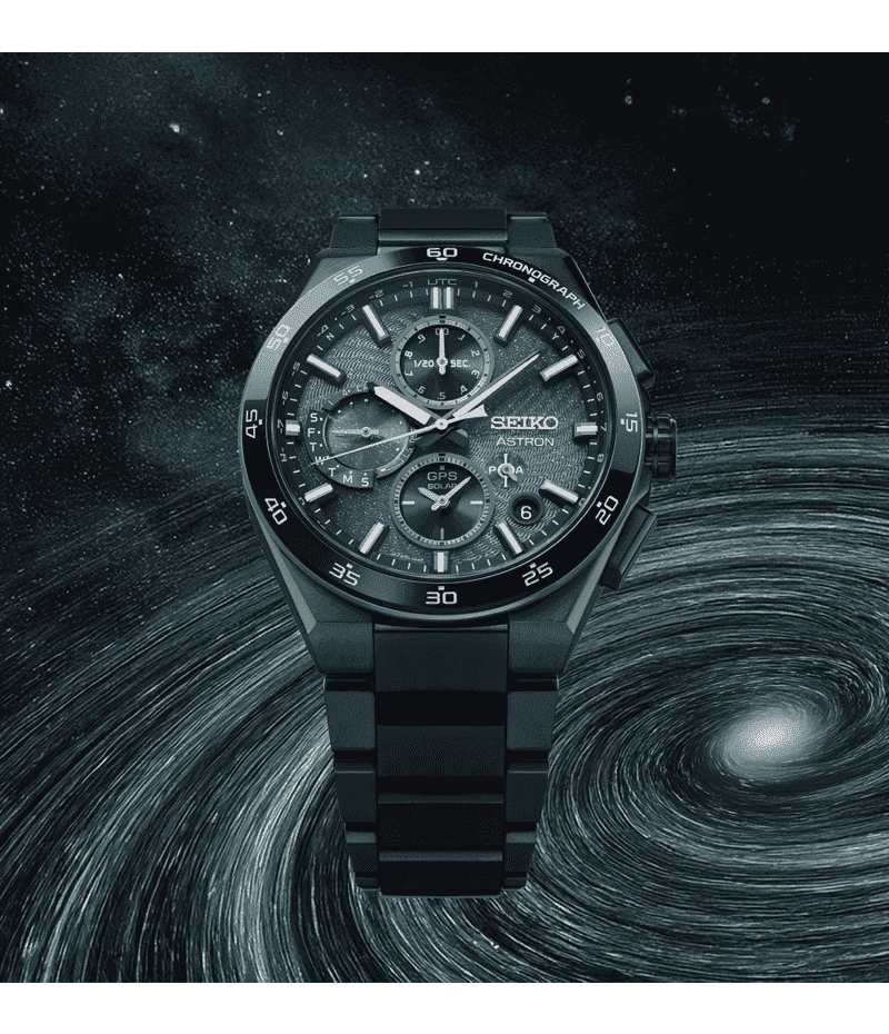 また、漆黒な宇宙の中で、渦巻く銀河が浮かび上がる様を、オールブラックカラーのケース・ブレスレットと、ダークターコイズカラーをベースとしたラメ入りダイヤルが表現しています。