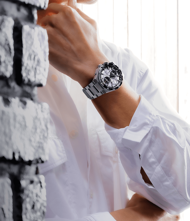 硬質で傷つきにくいセラミックスベゼルとチタン製の飾り縁を組み合わせた二体構造ベゼルに、“CHRONOGRAPH”の文字とアラビア数字をマーキングすることで、よりスポーティなデザインに仕上げました。