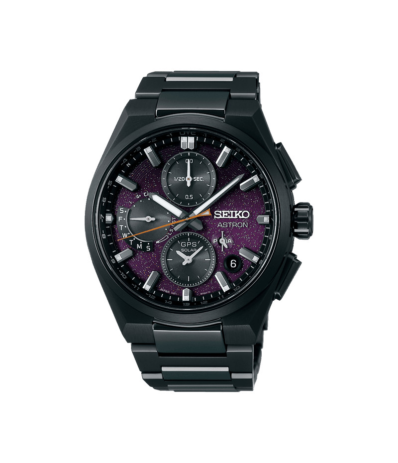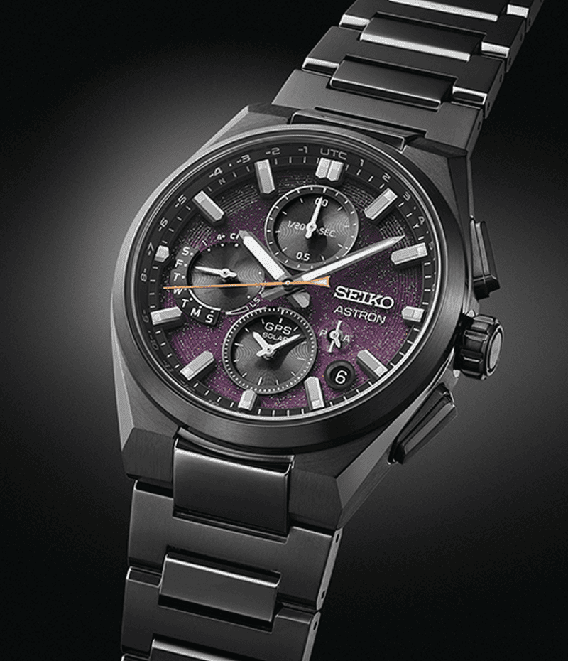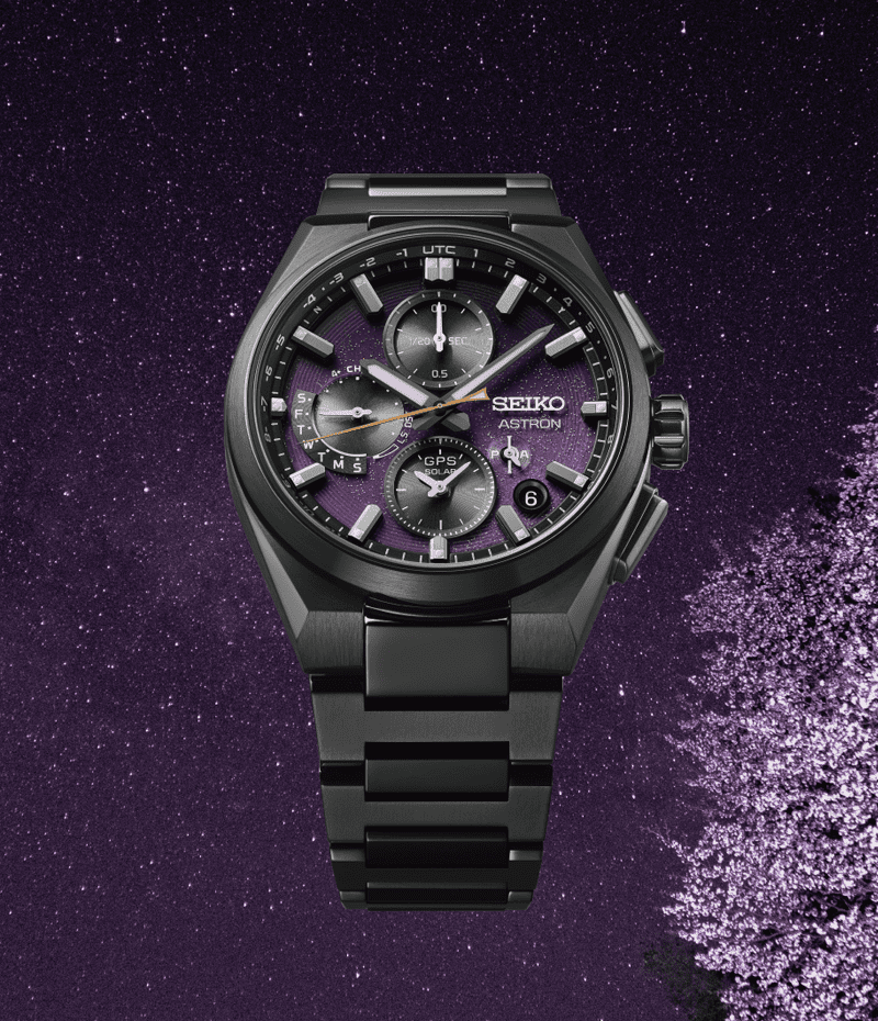 星空と風に舞う夜の桜が織りなす美しい情景を、オールブラックカラーのケース・ブレスレットと、パープルカラーをベースとしたラメ入りのグラデーションダイヤルで表現しています。ダイヤルの外周部には、星が描く軌跡のようなパターンを施しています。