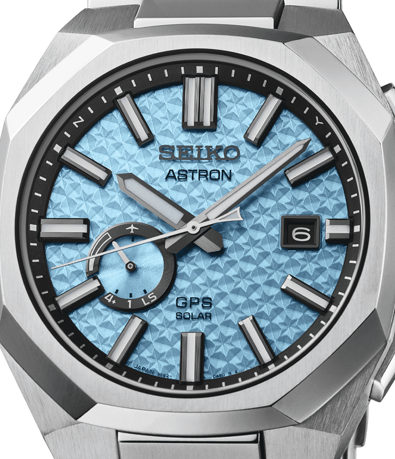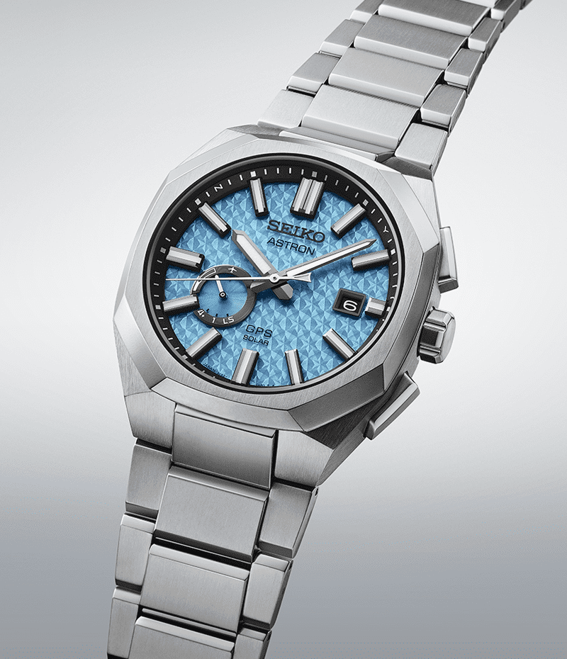 広大な夜空に瞬く、星々の力強く美しい輝きを、ダイヤルの透明感あるライトブルーと、星をモチーフとした、見る角度によって表情が変わる型打ちパターンで表現しています。